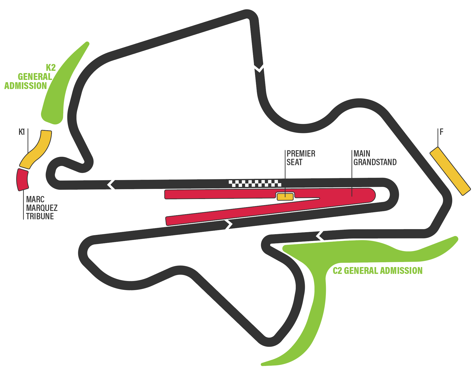 Ein Premier Roving-Ticket ermöglicht den Zugang zur Haupttribüne, zu den Tribünen K1 und F sowie zu den C2-Bereichen, beinhaltet jedoch keinen Zutritt zu den Fanzonen (wie der Marc Marquez Tribüne).